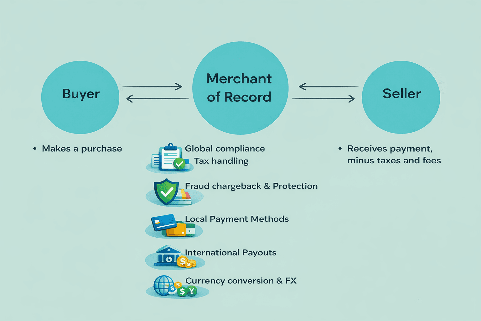 A Merchant of Record (MoR) collects payment and issues the invoice to the customer. They calculate and remit all local taxes (VAT/GST/sales tax) on your behalf. Manage compliance and liability, meaning they handle refunds, fraud checks, and chargebacks for that transaction.