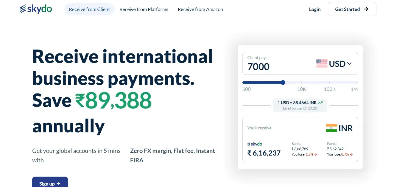 It gives you virtual foreign currency accounts so overseas clients can pay you as if to a local bank. Skydo then converts those funds to INR and deposits them in your Indian account all within 24 to 48 hours and even issues the required RBI compliance certificate (FIRC/FIRA) automatically.